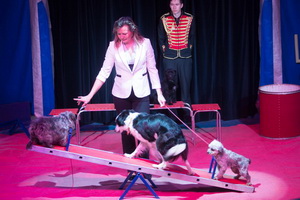 Madame Cecile präsentiert vier verspielte Hunde in einem temperamentvollen Ablauf. Vielerlei Sprünge und Lauf auf einer Tonne werden mit Hinterbeinlauf, schaukeln auf einer Wippe und tollen auf der Rutsche kombiniert.