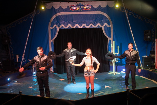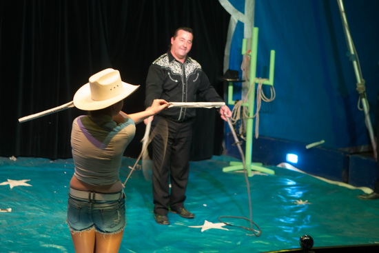Mit der Western-Show der „Troupe Williams“ geht es in die Pause. Die drei JuniorenInnen des Hauses verstehen es ausgezeichnet die Lassos zu handhaben. Virtuos werden die Seilschlingen in vielfältiger Weise um den Körper gewirbelt. Der Chef des Hauses demonstriert sein Können mit den Bull-Peitschen. Mit lautem Knall werden Zeitungsseiten in Papierschnipsel zerlegt; zwischen den Fingern oder im Mund gehaltene Papierröllchen nach und nach mit exakten Schlägen zerkleinert.