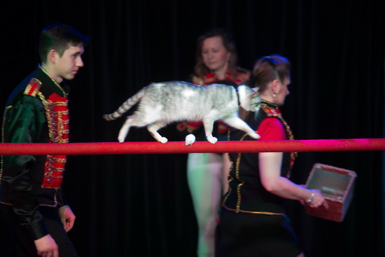 Im zweiten Teil des Programms präsentiert Brian zwei Katzen in einer ansprechenden Trickfolge. Die Stubentiger balancieren über eine Stange, laufen Slalom und zeigen weite Sprünge. Natürlich darf der in Frankreich beliebte Trick, bei dem die Katze über auf ihrem Weg liegende Mäuse hinweg läuft nicht fehlen. Spektakulärer Abschluss des Auftritts ist der Sprung durch einen Feuerreifen.