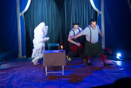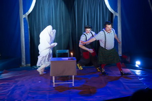Das große Entrée der Clowns bildet auch hier, wie zumeist im traditionellen französischen Circus den Höhepunkt und Abschluss des Programms. Direktor Alfred Fricheteau und sein Sohn Brian gehen mit Verve zu Werke und einiges Wortgeplänkel steht am Anfang ihres Auftritts. Schon bald kommt Madame Cecile mit einem „Brief“ für den Chef in die Manege und das in Frankreich überaus beliebte Spukschloss-Entrée nimmt seinen Lauf. Gekonnt und mit großer Spielfreude agieren die Clowns und der Herr Direktor animiert die anwesenden Kinder zu immer lebhafteren Reaktionen. Begeistert gehen diese darauf ein und mit lebhaftem Gekreische nehmen sie intensiven Anteil am Geschehen in der Manege.