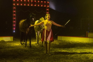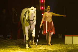 Latoya Donnert, Tochter von Meisterdresseur Gabi Donnert, präsentiert eine exzellente Freiheitsdressur mit zwei Araberhengsten. Souverän führt die charmante Dresseurin die Chambrière und präzise folgen die Pferde den Anweisungen. Zahlreiche Steiger sind die Highlights in diesem formidablen Auftritt.