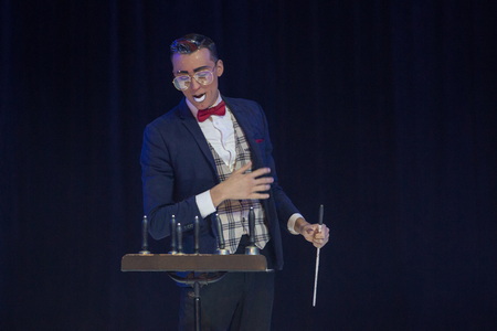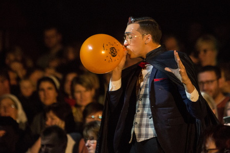 „Mr. Gerald“, wir begegnen ihm einige Male im Verlauf der Show, trägt ein Outfit – ausgewachsener Anzug, Fliege und Einstecktuch, Fake Pilotenbrille und abgewetzter kleiner Koffer zu goldfarbenen Schuhen – das ihn leicht als Komiker kenntlich macht. Er verteilt zunächst an vier ZuschauerInnen Glocken. Ein fünfter Mitspieler wird in der Manege mit Messingbecken ausgestattet und darf, nach einigen vorbereitenden Faxen den finalen Sound liefern. „Magic“ lautet das Credo einer weiteren Szene und Popcorn ergießt sich über Besucher. Schließlich tritt er die „Reise nach Jerusalem“ an.