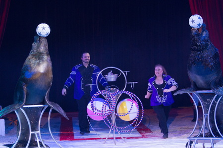 Zwei Darbietungen mit Tieren waren in der aktuellen Produktion zu erleben. Zunächst erfreuen Perry & Dani Pedersen-Jahn mit ihren Seelöwen „Teddy“ und „Scooby“ die Besucher. Die mächtigen Robben spielen Kopfball und Hula Hoop. Bälle werden auf der Schnauze balanciert und auch schauspielerisch zeigen sie sich talentiert. Trompetenspiel und fangen von Ringen, die zwei Kinder aus dem Publikum werfen, gehört gleichfalls zum Repertoire.