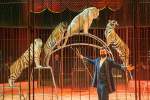 Zu Beginn des zweiten Teils ist Robano Kübler mit seinen Tigern – ein weißer und drei normalfarbene - zu erleben. In einer harmonischen Dressurfolge werden Pyramide, Sprünge und Hochsitzer aller Tiere präsentiert. Abliegen und Rollover sind weitere Elemente des Auftritts, der in einem fulminanten Vorwärtssteiger eines Tieres seinen Höhepunkt hat.