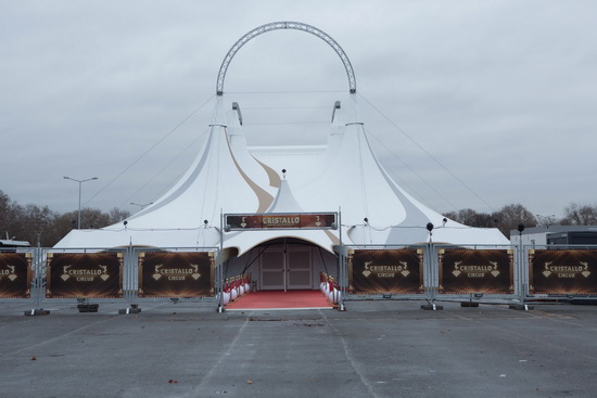 Auf dem städtischen Festplatz war der schmucke Circus aufgebaut. Fabrikneue große Zeltanlagen italienischer Produktion beherrschen den Circusplatz. In strahlendem weiß mit einem dezent-eleganten spiralförmigen Dekor in zartem grau und einem matten Goldton ziert die hoch bis zu den Mastspitzen reichende Plane, die am Rondell bogenförmig weit nach außen ragt. Ein lange Kuppel erstreckt sich am Chapiteau bis zwischen die Mastpaare und das zweimastige Vorzelt wird von einem hohen Gittermastbogen überragt. Hohe Zaunelemente, die mit Spannbändern die das Logo des Circus zeigen, gestaltet sind bilden die attraktive Front, die von einem Container mit den Kassenschaltern flankiert wird. Ein breites Portal in der Fassade öffnet, unter einem Zeltdach hindurch, den Weg zum Foyer, der mit einem roten Teppich ausgelegt ist. Weiße Kugelleuchten und edle rote Taue zwischen blinkenden Messingstützen säumen ihn und große Türen gewähren Einlass ins Foyer. In der Dunkelheit funkelt der Circus mystisch im Schein zahlreichen Scheinwerfern, die regelmäßig die Farben wechseln.