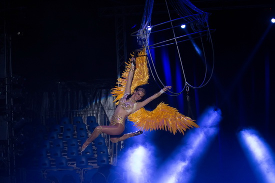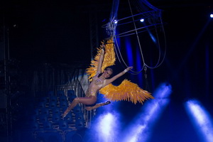 Mit einer Luftnummer am Kronleuchter startet die Nummernfolge. Ninja Riedesel, zu Beginn des Auftritts mit einer phantasievollen venezianischen Maske und großen goldenen Federflügel ausgestattet, bietet anmutig ihr Können in der Kuppel.