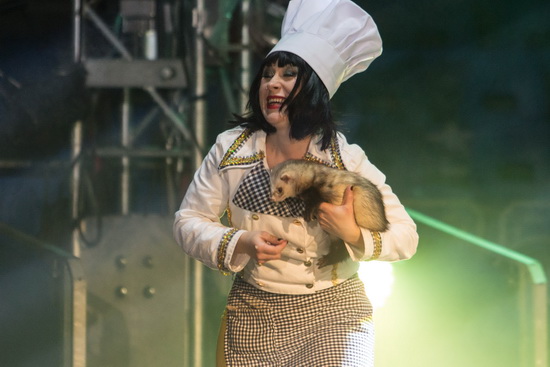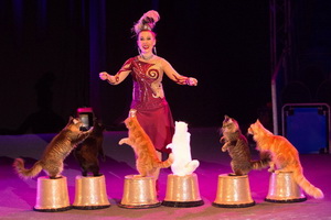 Gleichfalls mit zwei Darbietungen ist Anelia Krachinova im Programm vertreten. Zunächst sehen wir ihre temperamentvolle Arbeit mit Frettchen. Die kleinen Nagetiere wuseln in einer Küchenkulisse umeinander, überwinden Hürden, erobern Töpfe und transportieren Äpfel in ein Vorratsgestell. Wenig später folgen der Tierlehrerin sechs Hauskatzen in den roten Ring. Sie sitzen auf ihren Podesten hoch, balancieren über eine Stange, rollen auf einem Ball und beherrschen eine Reihe weiterer Tricks.