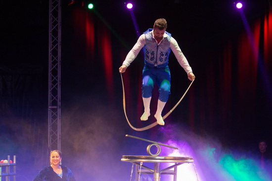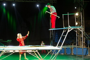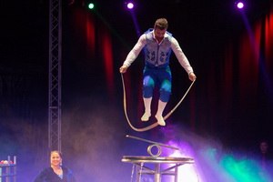 Direktor Amando Frank zeigt sein Können auf de Rola Rola. Sicher und souverän präsentiert er die abwechslungsreiche Trickfolge. Er jongliert mit Bällen, springt Seil und steigt durch Ringe. Schließlich türmen sich fünf Bänkchen unter seinen Füßen auf der Rola zu einem fragilen Gebilde.