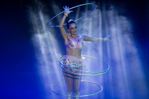 Im zweiten Teil der Show sehen wir die sympathische junge Frau wieder. Gekonnt und elegant präsentiert sie ihren Hula Hoop Act. In vielerlei Varianten kreisen die silbernen Reifen um ihren Körper.