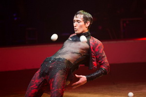 Jongleur Semen Krachinov arbeitet in seinem ausgefallen gestalteten Auftritt mit bis zu sieben weißen Bällen und Keulen. Mit großer Sicherheit und in hohem Tempo erfolgen die variantenreichen Routinen mit teilweise ungewöhnlichen Abläufen.