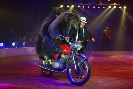 Die drei sehr gepflegten Longenbären der Berouseks sind als geschickte Akrobaten zu erleben. Die Tiere fahren Roller, lassen die Hula Hoops kreisen und steigen auf die Rola Rola. Kugellauf und Leiterbalancen, Seil springen und Antipodenspiele sind weitere Elemente der Darbietung. Ein Motorrad wird von einem Bären als geschicktem Fahrer gelenkt und auf dem Sozius nimmt zuerst ein weiterer Bär und hernach der Tierlehrer den Platz auf der Reise um die Manege ein.