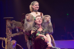 Maike und Jörg Probst bringen eine heutzutage eher ungewöhnliche Dressurdarbietung in den roten Ring. In fröhlicher und verspielter Weise interagieren die erfahrenen Tierlehrer mit ihren vier Hundskopfaffen.