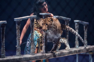 Die Raubtierdressur von Natalia und Andrej Shirokalov bildete den Höhepunkt des Festivals und wurde demzufolge auch mit einer „Goldenen Piste“ bedacht. In einem Netzkäfig, der außen an der Piste angebracht war, präsentierten die beiden Tierlehrer vier Tiger, zwei Leoparden und zwei schwarze Panther. Aufmachung und Ablauf der Darbietung zeigen deutliche Unterschiede zum hierzulande gewohnten. Ein glänzend lackiertes Holzpodium von etwa zehn Metern Durchmesser steht mitten in der Manege. Links des Podiums haben die Panther ihre Plätze auf hohen Podesten, auf der anderen sitzen die Tiger auf normalen Tonneaus. Mit Hochsitzern aller Tiere am Platz nimmt die Nummer ihren Beginn. Flaschenlauf eines Leoparden und danach eines Panthers mit zeitgleichem Slalom des Leoparden folgen. Die Tiger führen parallel einen Rollover aus und werden anschließend von Natalia Shirokalova „übertanzt“. Mit Seilen umwickelte starke Rundhölzer hängen senkrecht aus der Kuppel hernieder und werden von den Leoparden erklommen, woraufhin diese - einige Meter hochgezogen – durch den Raum schweben. Prächtige Vorwärts- und Rückwärts-Hinterbeinläufer eines Panthers und von den Tigern komplettieren den Ablauf. Spektakulär endet die Darbietung. Natalia Shirokalova kniet am hinteren Rand des Podiums und lässt sich nacheinander von zwei heranpreschenden Tigern überspringen.