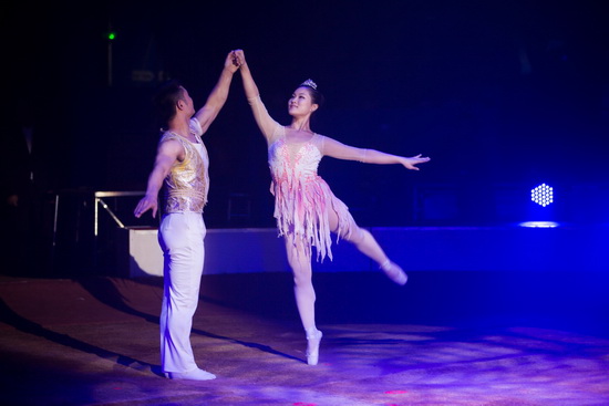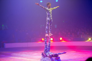 Das Duo Guang Dong war mit seinem besonderen "Pas de Deux" bereits in vielen großen Manegen zu Gast. Der Spitzentanz der Ballerina auf den Oberarmen des Partners verfehlt seine Wirkung auf das Publikums auch in diesem Rahmen nicht.