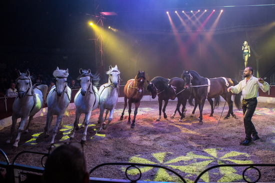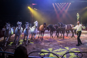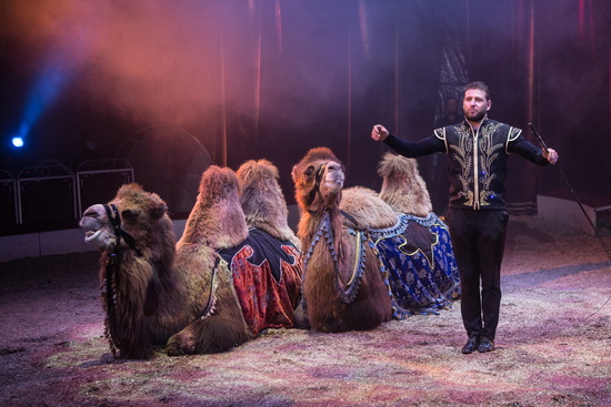 Weitere Tier-Darbietungen sind eine Exoten-Nummer, zwei Kamele zusammen mit zwei Watussirindern, die Anthony Renz in den roten Ring bringt. Ruhig und versiert läuft der Auftritt ab.