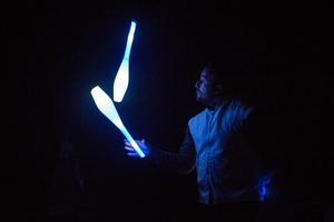 Bernardo Renz hat seine Keulenjonglage einem Relaunch unterzogen. Im abgedunkelten Zelt präsentiert er seine vielseitigen Routinen nun mit Requisiten, die per LED-Technik leuchten und dabei die Farbe wechseln. Gekonnt werden die Keulen manipuliert und schließlich fünf sicher in der Luft gehalten.