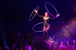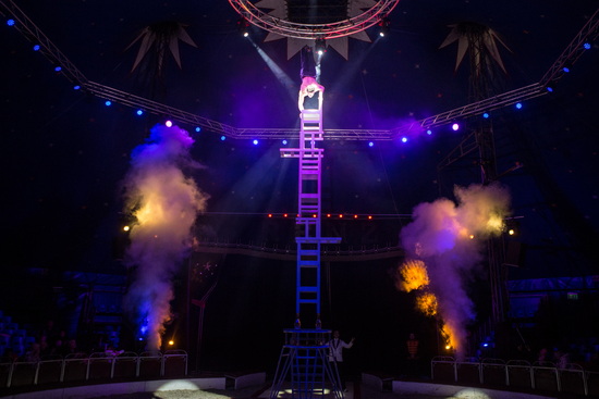 Miss Georgina ist eine vielseitige Luftartistin, die mit ihrem Können in vielen Programm des circus Renz International zu erleben war. Aktuell arbeitet sie ihre starken Tricks in erstklassiger Weise an einem Kronleuchter.