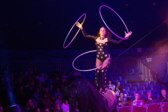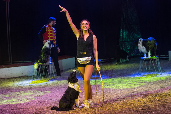 Kimberley Scholl lenkt den Spieltrieb von vier Border Collies in die gewünschte Bahn. Voller Eifer werden Sprünge in vielerlei Variationen und in allerhöchstem Tempo perfekt ausgefügt. Zudem präsentiert Kimberley Scholl ihren mitreißenden Act „Hula Hoop zu Pferd“. Auf dem Panneau eines kanternden Friesen Halt findend, lässt die Stehendreiterin die Reifen in vielfachen Variationen um ihren Körper kreisen.