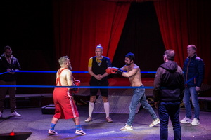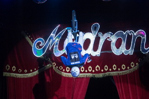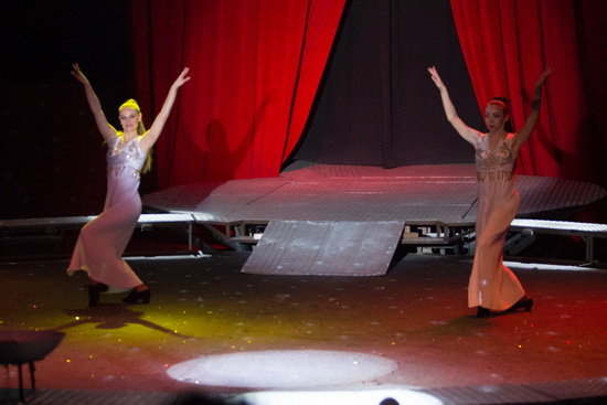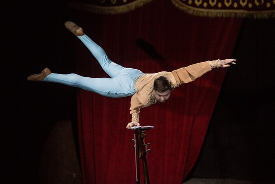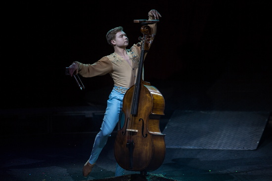 Mit der Finalnummer geschieht dann doch noch das inzwischen völlig Unerwartete. Wir erleben eine ansprechend in Szene gesetzte und stilistisch ausgearbeitete Darbietung, die sich völlig vom Rest des Programms unterscheidet. Ein Kontrabass ruht auf einem Ständer und die beiden Tänzerinnen imitieren Geigenspiel zu entsprechenden Klängen. Ein junger Artist, offensichtlich aus einer russischen Circusschule kommend, arbeitet auf dem Bass, der sich permanent dreht, und dem dazugehörigen Bogen eine poetisch inspirierte anspruchsvolle Handstand-Equilibristik. Der gesamte Auftritt erinnert im Ablauf und auch aufgrund der klassischen musikalischen Begleitung an Oleg Izossimov.