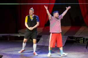 Die beiden Komiker sind drei Mal auf der Bühne präsent. Auftrittsstil und Kostümierung lassen die Frage aufkommen, ob Clownerie ihre Profession ist und falls ja wie lange schon. Eine längere Umbaupause überbrücken sie einfach mit dem schwenken ihrer Handy-Taschenlampen und fordern dabei das Publikum zum mitmachen auf. Im umfangreichsten Auftritt wird mit fünf Freiwilligen ein Boxkampf abgearbeitet. Ihre erste Szene bietet einen Applaus-Wettbewerb der in ein imaginäres Federballspiel mit einem Zuschauer übergeht. Diese Reprise leidet zusätzlich enorm unter dem Aufbau des Slackline Requisit des nachfolgenden Artisten. Dieser läuft während der gesamten Reprise auf der Bühne umher um seinen Apparat aufzubauen und mit großer Gestik „auszuloten“ ob das Ganze auch im richtigen Winkel steht.