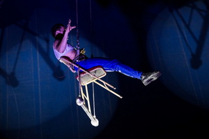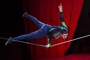 Der gleiche Artist bietet im zweiten Teil des Programms einen Auftritt auf dem Washington-Trapez. Der junge Mann arbeitet exzellente Tricks, leider recht uninspiriert, in extremer Höhe und ist damit, dieses Mal hauptsächlich für die untere Hälfte der Sitzreihen, kaum zu sehen. Noch dazu ist der Durchhang der Zeltplane so groß, das man von den oberen Reihen nicht in die schmale Kuppel schauen kann und das weit schwingende Requisit irgendwann einfach „nach oben verschwindet“.