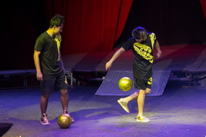 Zwei Herren zeigen in einer Art Balltraining ihre Fertigkeiten per Kopf und Fuß mit einem Fußball umzugehen.