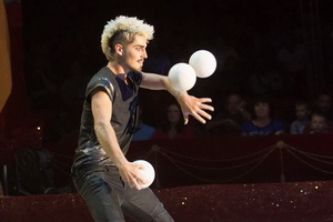 Jongleur Zdenek Polach entfacht mit weißen Bällen einen furiosen Wirbel. Temperamentvoll erfolgen die unterschiedlichsten Routinen und der sympathische junge Mann erhöht sukzessive die Anzahl der jonglierten Bälle, bis schließlich deren sieben sicher gehandhabt werden.