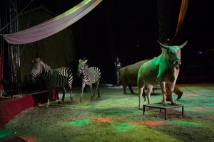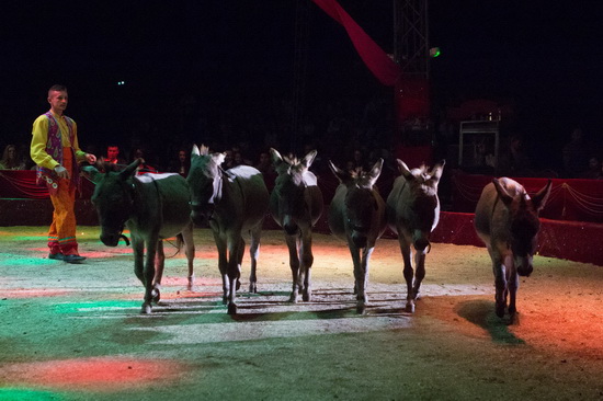Die zweite Dressurdarbietung des Programms sieht gleichfalls Rico Fontbonne als Vorführer. Fünf Shetland-Ponys trippeln die ersten Figuren in den Manegensand und werden alsbald von sechs Eseln abgelöst. Diese beherrschen ein umfangreiches Repertoire verschiedener Lauffiguren, das in flottem Ablauf gezeigt wird. Drei Kamel, zwei Dromedare und drei Lamas bieten die nächsten Abläufe. Schließlich liegen die Kamele an der Piste ab, drei Rinder verschiedener Rassen steigen auf Tonneaus und zwei Zebroiden sowie die Lamas überspringen die Kamele. Abschließend läuft ein Zebra seine Figuren um die Rinder.