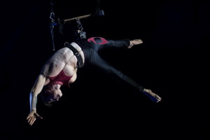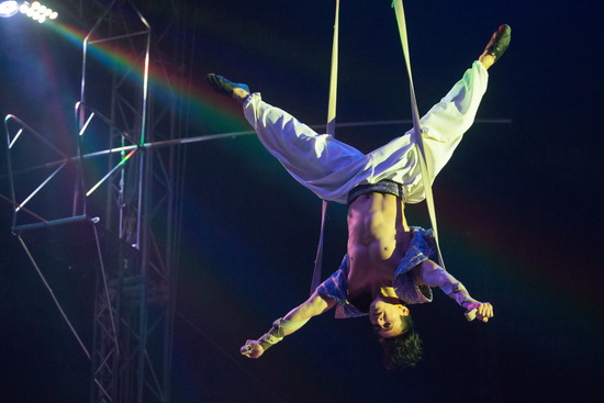 Mit dem Showeffekt eines „Fliegenden Teppich“ wird eine weitere Luftnummer eingeleitet und weite Flüge an den Strapaten werden im Folgenden von einem Artisten gekonnt ausgeführt.