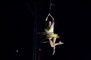 Tempo geladen arbeitet Evita Ronzally ihre Hula Hoop Darbietung. Zu einigen Tricks lässt sich die Artistin an einer Handschlaufe, während die Ringe um ihren Körper kreisen, hoch in die Kuppel ziehen und verleiht dem Auftritt damit einen besonderen Drive.