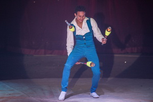 Alfredo Rodriguez jongliert mit Tempo und variantenreich mit verschiedenen Requisiten. Er startet seine Routinen mit drei Keulen und steigert dann über vier auf fünf, die sicher manipuliert werden. Mit kleinen Bällen erfolgen die nächsten Touren, zu deren Ende die Requisiten in kleinen Gürtelsäckchen landen. Zum Finale seines Auftritts hantiert der quirlige Artist mit Sombreros.