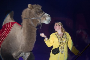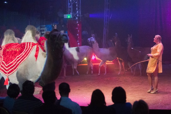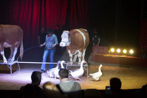 Zwei routiniert ablaufende Dressurdarbietungen werden in der besuchten Vorstellung letztmalig von Karin Houcke, sie wechselt anschließend in die USA zur Hanneford Corporation, vorgeführt. Das sind zum einen die Bauernhoftiere, deren Auftritt im Cowboy-Look gestaltet wurde. Zwei mächtige braun-weiße Kühe zeigen Elemente der Freiheitsdressur und alsbald gesellen sich drei Wollschweine hinzu. Die Kühe nehmen ihren Platz auf Postamenten ein, derweil eine Gänseschar ihre Runden dreht. Ihnen folgen zwei Ziegen und Barrieresprünge zweier Ponys. Ein Pony-Steiger beendet die mit lebhaften Beifall aufgenommene Nummer. Wenig später lässt die versierte junge Dresseurin vier Kamele zusammen mit vier Lamas variantenreiche Figuren ablaufen.