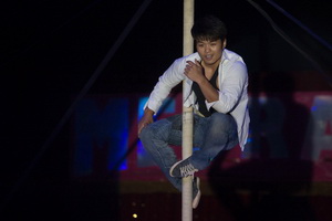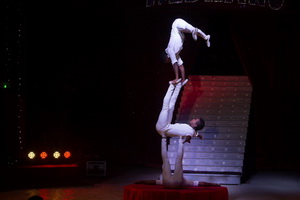 Das vietnamesische Duo Thu Hiep arbeitet starke Tricks am Washington Trapez. Bei seinen Soloaktionen zeigt der männliche Part kraftvolle Handstandvariationen am weit ausschwingenden Requisit. Ein furioser Zahnhang-Nackenwirbel der Partnerin ist der Höhepunkt der Evolutionen.
