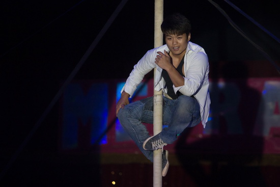 Die an dieses Eröffnungsszenario anschließende Mastakrobatik sieht in jener Show nur einen Akteur und fällt dadurch ein wenig kurz aus. Nichts desto Trotz werden anspruchsvolle Tricks gearbeitet, die mit spektakulären und knapp über der Erde abgefangenen Abfallern beendet werden. Mit einem longengesicherten Salto, in großer Höhe ausgeführt und am Mast gelandet, hat die Nummer ihren Höhepunkt.