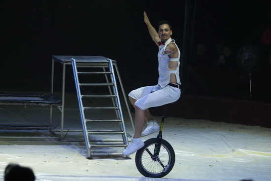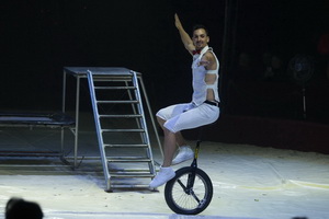 Fahrradartistik ist das Metier von Lenard Matos. Zwei hohe Podeste, zu denen eine Treppe emporführt, sind mittels eines Trampolins verbunden und dieses Konstrukt bildet die Basis der interessanten Trickfolge auf dem Einrad.Rasant geht es die Treppe hinauf und hinab und zahlreiche Sprünge werden vom Trampolin aus auf eine der beiden Plattformen gekonnt vorgetragen. Schließlich verbindet der Künstler die Podeste mit einem schmalen und mit Fackeln bestückten Steg. Die Flamme mit der die Fackeln entzündet wurden verlöscht Lenard Matos im Mund, ehe die Fahrt durch die Flammen startet.