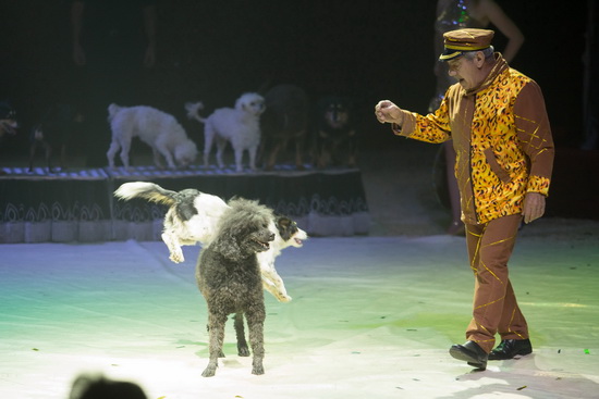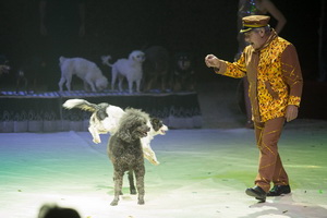 Mit drei Dressur-Darbietungen ist die Familie Huesca zu erleben. Zunächst erobert eine muntere Hundemeute die Manege. Fröhlich tollen die acht Vierbeiner unterschiedlicher Rassen umher, stets eifrig bemüht den Anweisungen ihres Vorführers nach zu kommen.