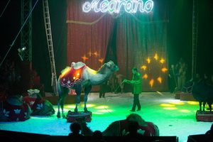 Vor der Pause präsentiert Wesley Huesca einen neu formierten Exotenzug mit Tieren aus vier Kontinenten, wie die Ansage aus dem Off verlauten lässt. Zunächst laufen fünf junge, noch nicht ausgewachsene Dromedare ihre vielfältigen Figuren während die Sänger den BoneyM-Hit „Rivers of Babylon“ intonieren. Noch ist der Ablauf ein wenig langsam, jedoch absolut sicher und fehlerfrei. Bald ergänzen ein Kamel und ein Zebu sowie zwei Lamas die Formation. Drei mit Stoffaffen berittene Ponys bieten zur großen Freude der kleinen Besucher das Da Capo.