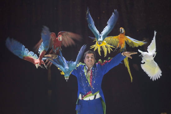 Den Reigen der Tier-Darbietungen komplettiert Juan Guttierez mit seinen Papageien. Sechs prächtige Aras und ein weißer Kakadu erobern die Herzen der Besucher im Sturm. Sie hissen eine Flagge, laufen Rollschuh und schieben einen Mini-Einkaufswagen. Ein großes elektrisch betriebenes Kinderauto ist gleichfalls in den Ablauf involviert. Einen besonderen Eindruck erzielen stets die lautlosen weiten Flüge der großen Vögel über dem Gradin.