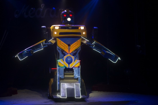 Das lang erwartete Highlight der Vorstellung, in erster Linie für die zahlreichen jungen Besucher, ist das Erscheinen des Transformers. Mit sonorem Sound rollt im Schwarzlicht ein gelb lackierter „Sportwagen“ in die Manege. Nach ein paar knappen Fahrmanövern hebt sich das Vorderteil des Gefährts empor und das Automobil verwandelt sich in eine mehrere Meter hohe Robotergestalt. Blitzende rote und blaue LED-Ketten markieren die Konturen, während sich die zu Armen mutierten Türen heben und senken. Die Auto-Scheinwerfer blenden ins Publikum und im Roboterkopf, der aus dem Motorraum ausfuhr, leuchten blaue Lampen. Fasziniert verfolgen nicht nur die kleinen Zuschauer die Metamorphose und die Bewegungen des auch aufgerichtet noch fahrfähigen Vehikels.