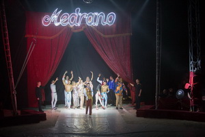 Lucas Galleoti arbeitet an den Strapaten die zweite Luftnummer der Show. Kraftraubende Tricks werden in weiten Flügen präsentiert und kennzeichnen die poetisch und ruhig gestalteten Auftritt.