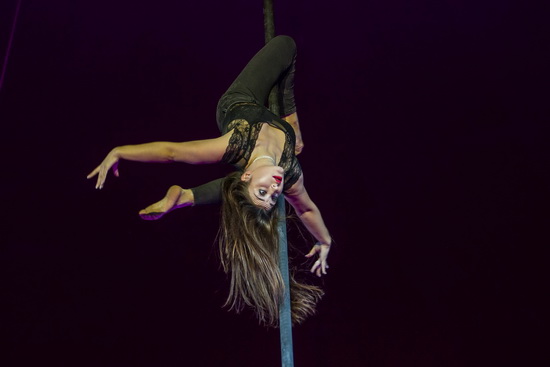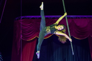 Die artistische Überraschung des Programms überhaupt ist Alesandra Rizaeeva am Flying Pole. Nach den ersten, in der Manege ausgeführten Tricks schwebt die junge Frau mit dem Requisit hoch in die Lüfte und füllt den weiten Raum der Kuppel. Enorm kräftezehrende Tricks werden von der zierlichen Artistin, so hat es den Anschein, mit spielerischer Leichtigkeit ausgeführt und teilweise geht sie ein recht hohes Risiko bei den ungesichert ausgeführten Abläufen ein.