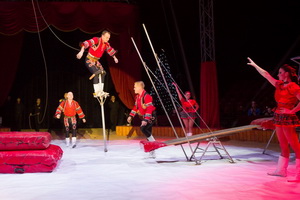 Schließich wird mit dem Schleuderbrett-Act die dritte der attraktiven Darbietungen der Truppe geboten. Temperamentvoll erfolgen die verschiedenen Tricks und die abschließenden Saltos auf Stelzen markieren den Höhepunkt des Auftritts.
