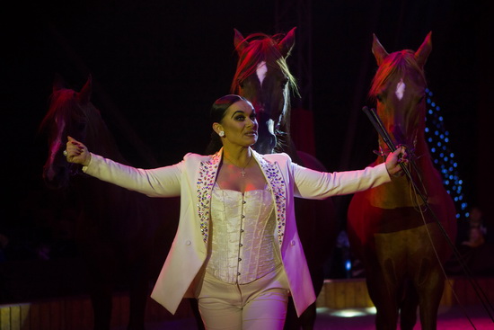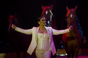 Im zweiten Teil der Show ist Adriana Folco die elegante Vorführerin einer Freiheitsdressur mit vier braunen und zwei weißen Araberhengsten. Zu geschmackvoller Musik werden die ersten Touren werden von den dunklen Tieren absolviert, dann kommen die Schimmel dazu und die Aktionen gewinnen an Vielfalt. Gekonnt lässt die erfahrene Tierlehrerin drei Pferde flechten und mit verschiedenen temperamentvoll ausgeführten Steigern findet der Auftritt seinen idealen Abschluss.