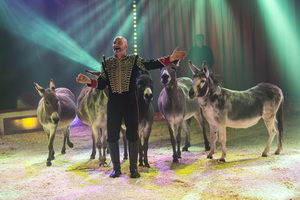 Den Schwung des Opening greift Rudy Althoff bei seiner Esel-Freiheit auf. Temperamentvoll und in Interaktion mit dem Publikum leitet der versierte Tierlehrer die sechs Grautiere zu ihren vielseitigen Lauffiguren an. Souverän erfolgt der Ablauf und die Esel zeigen sich von ihrer besten Seite und lassen die ihnen oft nachgesagte Sturheit völlig vergessen.