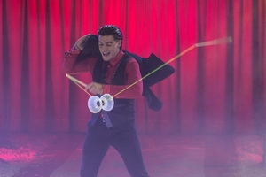 Michael Zorzan hat seine Diabolo Jonglage in eine ausführlich erzählte Geschichte gekleidet. Als verspäteter Flugpassagier stolpert er über einen Koffer, öffnet ihn kurzerhand und findet darin die Jonglier-Utensilien. Viele hochkarätige Muster werden mit einem und zwei Diabolos gekonnt geboten. Schließlich erfolgen Routinen mit drei, vier und gar fünf Diabolos, die zur gleichen Zeit hoch in die Kuppel fliegen und stets sicher gefangen werden.
