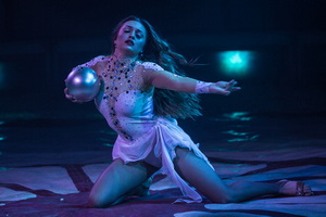 Einen sehr stark poetisch inspirierten Auftritt bietet Vanessa Berousek. Zu dramatischen Klängen und im Rahmen einer ebenso ablaufenden Choreographie, die in weiten Passagen an Abläufe der rhythmischen Sportgymnastik erinnert, präsentiert sie ihre Jonglage mit bis zu fünf Gummibällen.