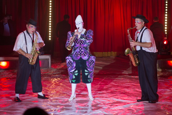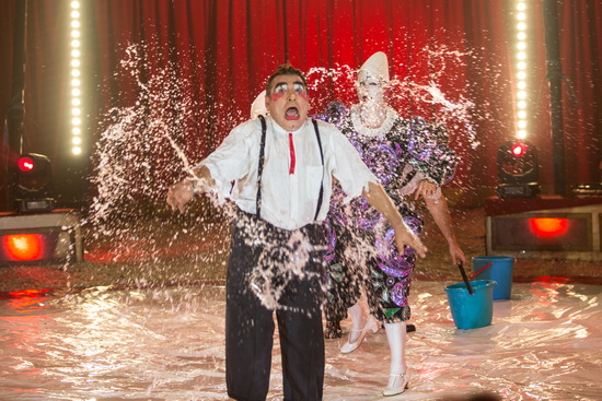 Klassische Clownerie, hervorragend dargeboten – das „José Mitchel Trio“ begeistert mit Spielfreude, großem komödiantischem Können und hoher Musikalität. Besondere Erwähnung verdient der elegante „Sac“ der Weißclownin. Zunächst sehen wir José Mitchel solo in zwei Reprisen. Er erobert das in der manege stehende Mikrofon und „singt“ mit sich selbst ein Duett, wobei ihm ein Wischmopp dabei hilft optisch der weiblichen Rolle zu entsprechen. Als Exhibitionist kündigt er die Pause an. Schließlich erleben wir das Trio im großen Entree, das die beiden Auguste – aus dem Gradin kommend – stimmungsvoll mit „somewhere over the rainbow“ auf ihren Saxophons beginnen. Die anschließende Wasserschlacht zieht die Zuschauer egal welchen Alters in ihren Bann. Mit Eifer, immer größer werdenden Wassergefäßen und beständig hektischer agierend sind die Auguste zugange und das Publikum fiebert kollektiv dem Moment entgegen in dem sich das Wasser über die Weißclownin ergießen wird.