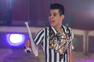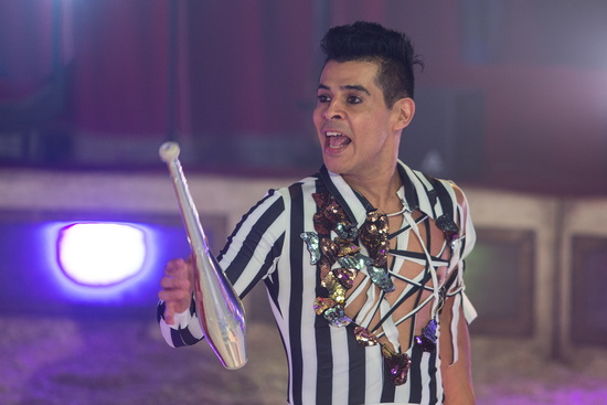 Der mexikanische Jongleur Pablo Martinez präsentiert sein Können in hohem Tempo Mit silbernen Keulen werden die ersten Touren absolviert. Weiter geht es mit Tischtennisbällen, die aus dem Mund hoch katapuliert und sicher wieder gefangen werden. Temperamentvoll hält er schließlich Sombreros in der Luft und der letzte wird mit einem weiten Hechtsprung knapp über dem Manegenboden gefangen.