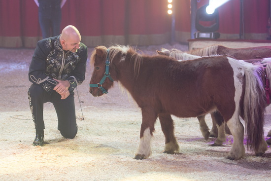Sechs muntere Shetland Ponys trippeln ihre Figuren in den Manegensand. Souverän lässt Tierlehrer Rudi Althoff die Minipferde ihr umfangreiches Repertoire ausführen. Nach einiger Zeit kommen weitere sechs schwarze Ponys hinzu und mit dem Zwölfer-Zug nimmt der Auftritt seinen weiteren Verlauf.