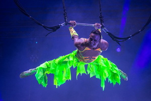 Einen ersten Act in der Luft bietet David Hammarberg. Nach einigen Figuren am Trapez erfolgt ein Wechsel an Bungee-Seile. Vielseitige Flüge füllen die weite Zeltkuppel.